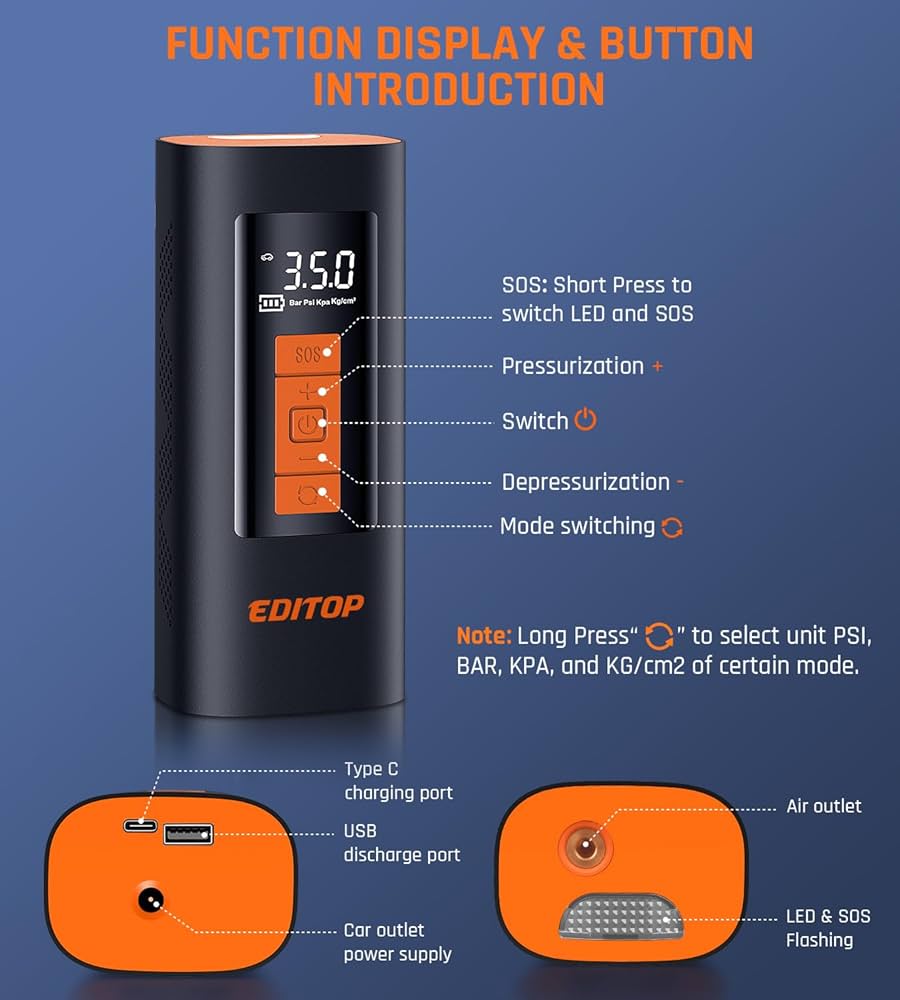 🚀 پمپ باد هوشمند و قابل حمل EDITOP (150 PSI)پمپ باد هوشمند EDITOP ابزاری ضروری و جمعوجور برای هر خودرو، موتورسیکلت یا دوچرخهسوار است. این دستگاه بیسیم با طراحی ارگونومیک، باد کردن تایرها و وسایل بادی را آسان و دقیق میکند.✅ ویژگیهای کلیدی:قدرت بالا: حداکثر فشار 150 PSI، مناسب برای تایر خودرو، موتور و دوچرخه.خاموشی خودکار (Auto Shut-Off): کافی است فشار مورد نظر را تنظیم کنید؛ دستگاه پس از رسیدن به آن، به صورت خودکار خاموش میشود و از باد شدن بیش از حد جلوگیری میکند.نمایشگر دیجیتال: نمایش دقیق فشار باد در لحظه و تنظیم آسان.چراغ اضطراری SOS: دارای چراغ قوه LED برای دید بهتر در تاریکی و حالت چشمکزن SOS برای مواقع اورژانسی.کاربری چندگانه: پشتیبانی از واحدهای مختلف فشار (PSI, BAR, KPA, $\text{KG}/\text{cm}^2$).با این دستگاه، همیشه و همهجا از فشار باد مناسب تایرهای خود اطمینان داشته باشید!